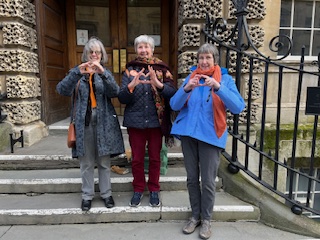 To recognise International Women’s Day , 3 Bath Soroptimists stood outside Bath Guildhall after an Orange Cafe event to raise awareness of ‘No to violence Against Women’.