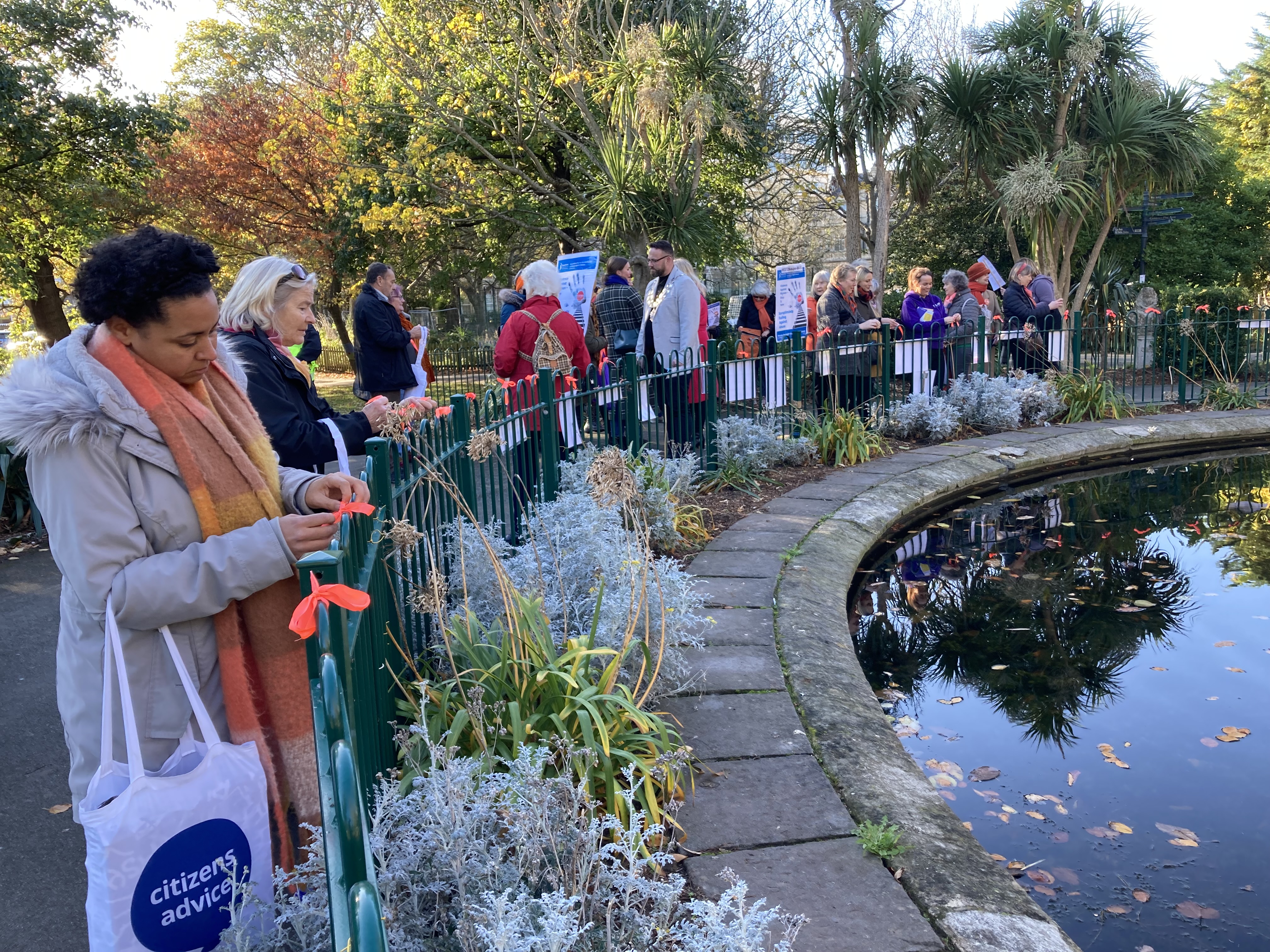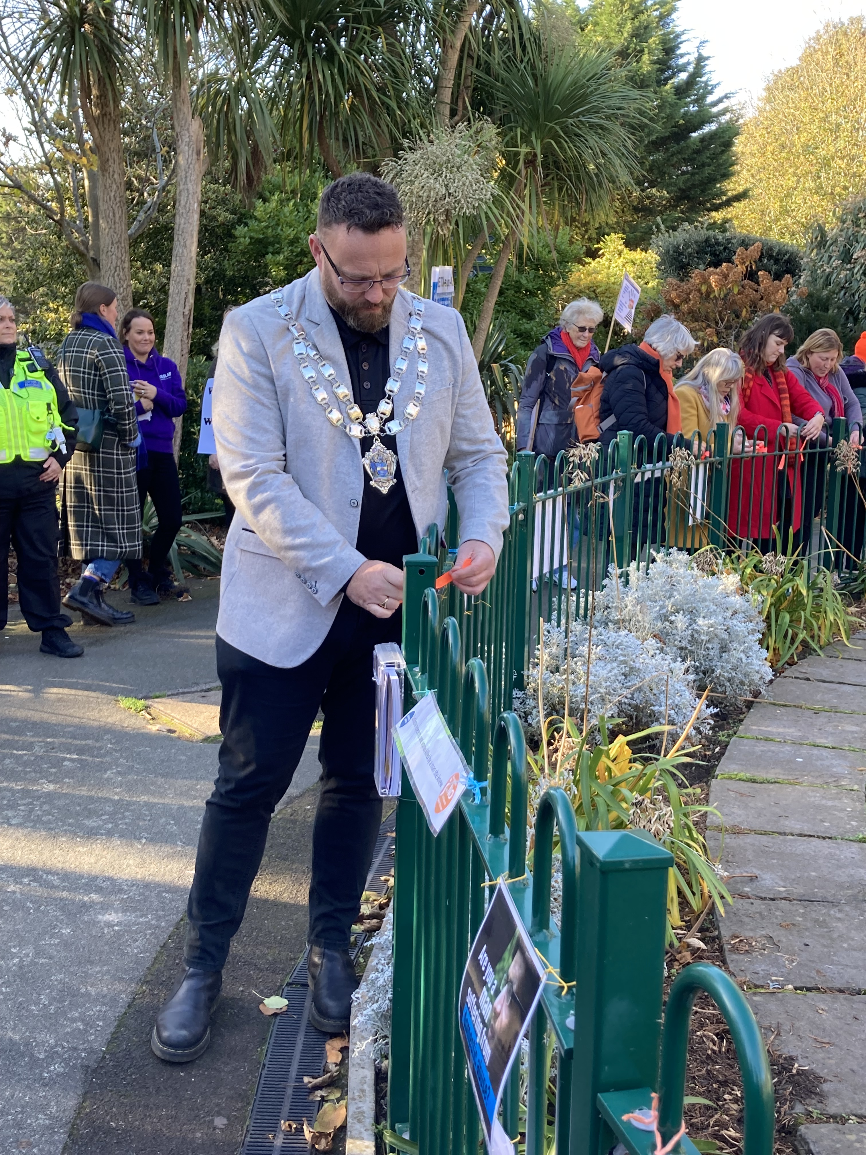 November 25, 2021Members gave out ‘Love me, love me not’ bookmarks to mark the International U.N Elimination of Violence Against Women day. Orange ribbons were tied on the railings of Grove Park, WSM with the Mayor taking part as well.