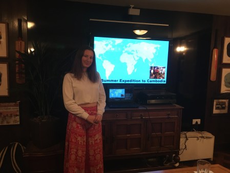 October 21, 2019Tamsin who attends Abbeyfield School in Chippenham raised money to take her on a volunteering trip to Cambodia to help with several projects in remote villages as well as taking on some strenuous treks there. Her adventure lasted a month and she wrote up a journal of her thoughts and experiences with accompanying photos whilst she was there . Her presentation was very informative and we were happy that we sponsored her for such a worthwhile cause. However, we were not too impressed with the amount of tarantulas that she encountered on her travels!